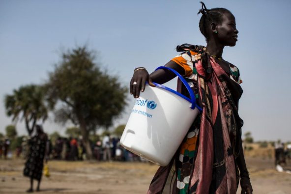 南スーダンのユニティ州の村で、ユニセフの支援物資のバケツを持つ女性。 |