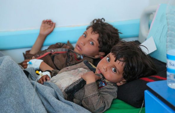 イエメンのサヌアにある病院で、コレラの治療を受ける子どもたち。 |