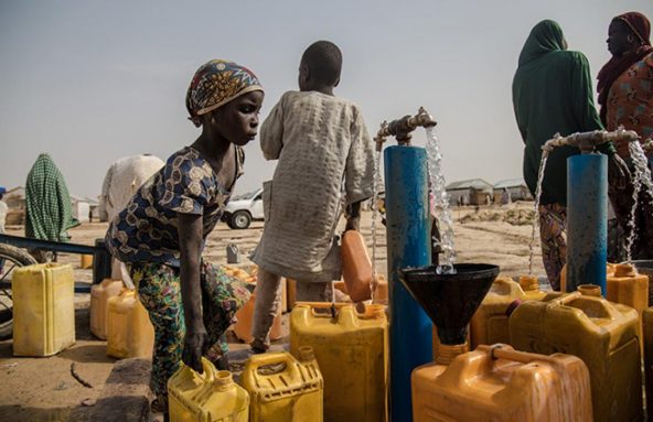 ナイジェリアのボルノ州マイドゥグリのダロリ・キャンプ内に設置された水道から、水容器に水を汲む国内避難民たち。 |