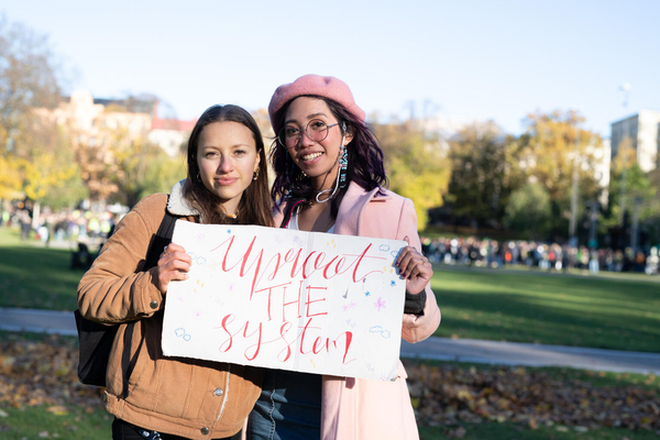 ストックホルムで、気候変動に対する行動を促す抗議活動に参加するニッキーさん(左)とミッチーさん(右)。(2021年10月22日撮影)