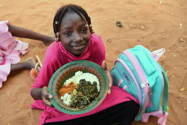 首都ニアメの学校で、給食を食べる7歳のジェミラさん。(ニジェール、2021年10月12日撮影)