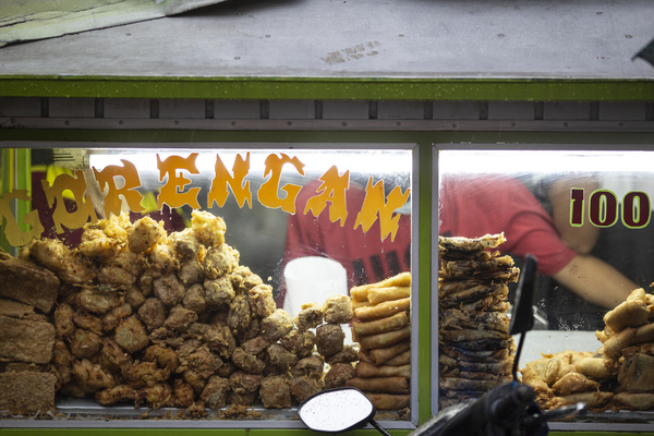 首都ジャカルタにある屋台のジャンクフード。(インドネシア、2021年4月撮影)
