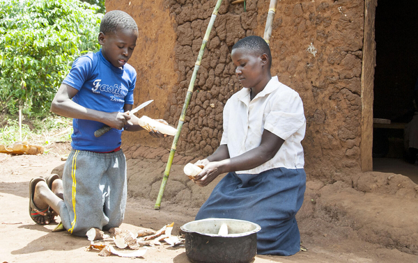 母親と昼食の準備をする12歳のマイコさん。(ウガンダ、2021年9月撮影)