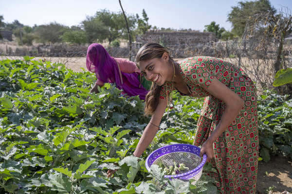 ラージャスターン州で、家族の健康のために野菜を栽培し、収穫する17歳のカムラさん。(インド、2020年12月撮影)