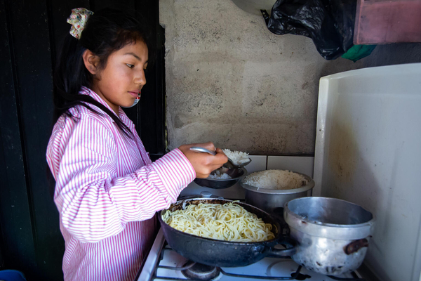 両親のために作ったお米とヌードルを昼食に準備する13歳のマルダリータさん。(エクアドル、2021年7月撮影)