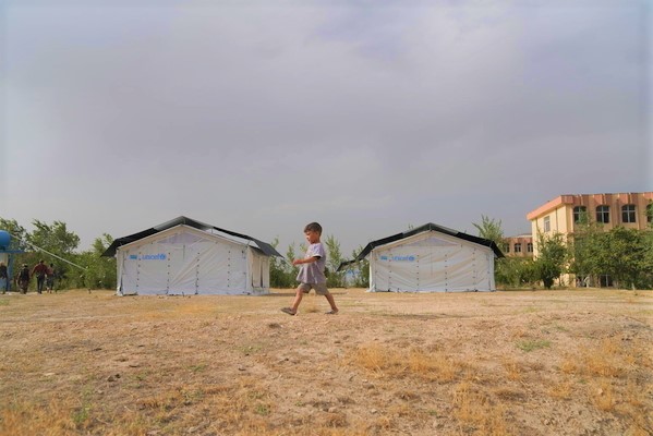 クンドゥズ州、サーレポル州、タカ―ル州から避難してきた400世帯以上の家族が生活するカブール市内の高校で、ユニセフが設置しているテントのそばを歩く子ども。(2021年8月撮影)※本文との直接の関係はありません