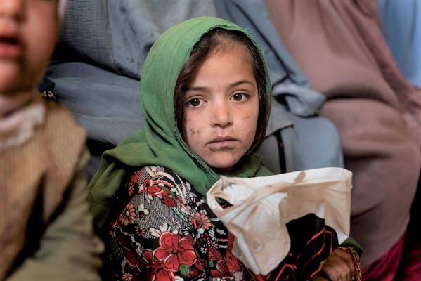 カンダハールにあるユニセフが支援するクリニックの待合室で、診察を待つ女の子。(2021年11月16日撮影)
