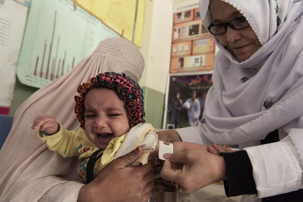 カンダハールにあるクリニックで、上腕計測メジャーを使って栄養状態のチェックを受ける子ども。(アフガニスタン、2021年11月15日撮影)