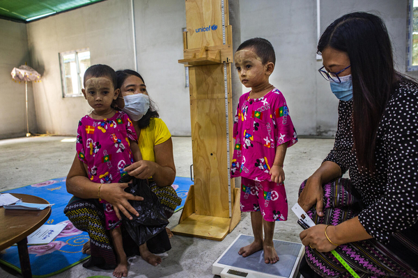 栄養治療食の摂取を含む栄養支援プログラムの一環で、体重を計測する3歳の男の子。(ミャンマー、2021年11月12日撮影)