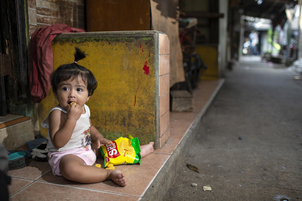 北ジャカルタのスラム街で、スナックを食べる生後11カ月のサルサビラちゃん。(インドネシア、2021年4月撮影)