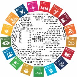ニセコ町はSDGs未来都市ということで指定をいただいています。その中でいろいろな取り組みをしていますが、CFCIも含めて、まちの取り組みのほとんどすべてがSDGsにつながるのではないかと思っています。町民向けに作成している予算説明資料「もっと知りたいことしの仕事」の中にも、「町の取り組みとつながっているSDGs」という図があります。SDGsの目標と町の施策との関係性を円の中にまとめて表現しています。これを見ていただいてもわかるように、町の仕事はほとんど、SDGsと何らかの関係があって、CFCIもSDGsの取り組みの一つです。