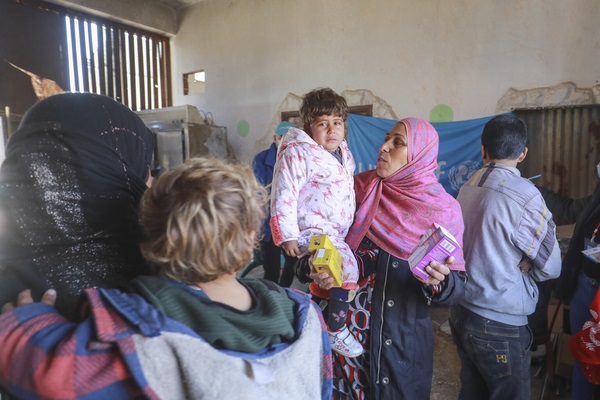 ハサカにある避難所のユニセフが支援する移動式クリニックで、栄養不良を防ぐための微量栄養パウダーを受け取った国内避難民の子どもと母親。(シリア、2022年1月28日撮影)