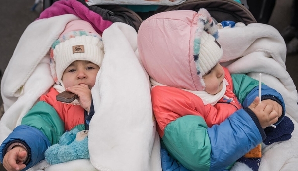 ルーマニアの難民キャンプにたどり着いたウクライナ難民のサーシャちゃんとダーシャちゃん。(ルーマニア、2022年2月28日撮影)