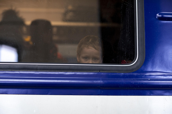 西部リヴィウ駅でポーランドのプシェミシル行きの列車の窓から外を見る男の子。(ウクライナ、2022年3月5日撮影)