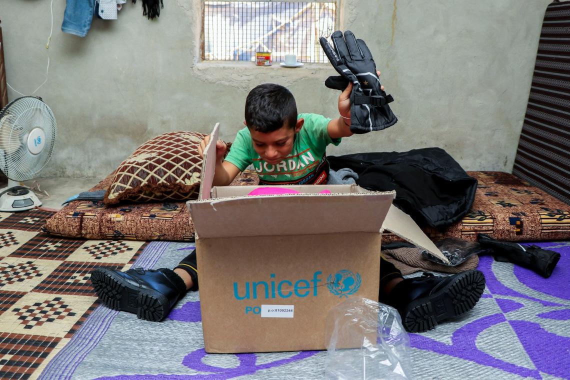 ユニセフが提供した冬服キットの箱にはそれぞれ、冬用ジャケット、毛糸のセーター、防寒着、暖かい冬用ズボン、毛糸の帽子、マフラー、手袋、靴下、冬用ブーツ、暖かいパジャマが含まれています。赤ちゃん用キットには、ボディスーツ、綿の手袋・帽子・靴下のセット、赤ちゃん用毛布、赤ちゃん用コート、抱っこ紐、赤ちゃん用の衛生用品も含まれています。