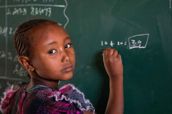 ティグライ州のユニセフが支援する学校で、黒板にむかう女の子。エチオピアでは、COVID-19と紛争の影響で2020年3月から学校が閉鎖されており、推定140万人の子どもが学習の機会を失っている。 (エチオピア、2021年10月撮影)