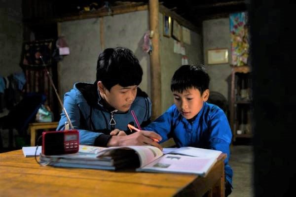 ラオカイ省に住む、15歳のドゥオンさんと13歳のタインさん兄弟。COVID-19の影響で多くの同級生がスマートフォンやパソコンを使ってオンライン授業に参加する中、古いラジオで授業を録音して聴いている。 (ベトナム、2021年12月撮影)