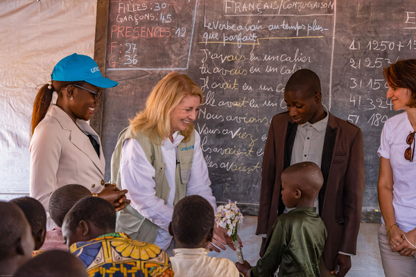 国内避難民キャンプで暮らす子どもたちを訪問したユニセフ事務局長のキャサリン・ラッセル。 (コンゴ民主共和国、2022年4月5日撮影)
