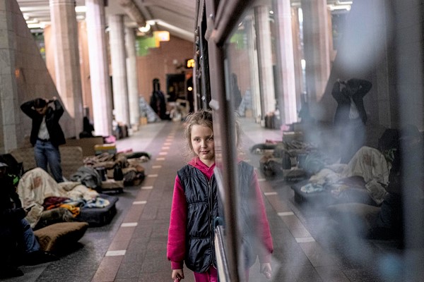 避難所となったハルキウの地下鉄の駅で暮らす9歳のポリーナさん。ウクライナでは770万人の人々が国内避難民となっている。(ウクライナ、4月19日撮影)
