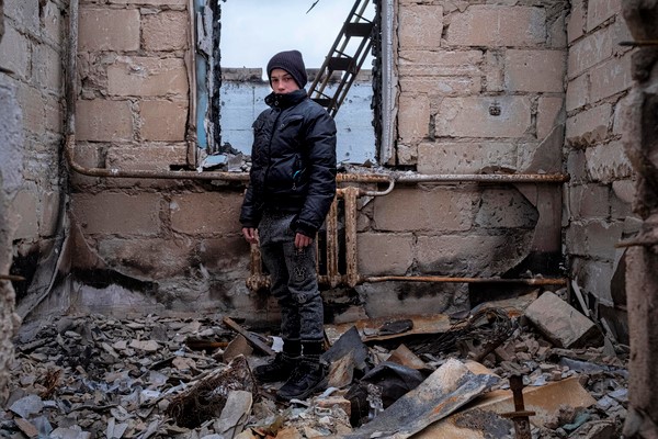 破壊された自宅で立ちすくむ12歳のダニーロさん。彼の祖母は「帰る場所もなければお金も食料もない。すべてが焼かれてしまった」と話す。(ウクライナ、4月16日撮影)