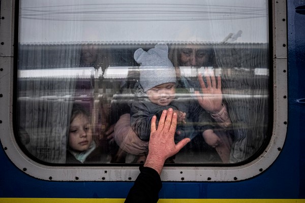 ハルキウから避難するための電車に乗り、残る家族に別れを告げる親子。(ウクライナ、2022年4月20日撮影)