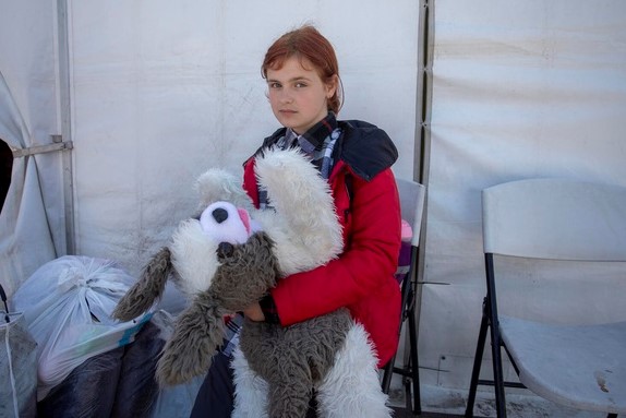ザポリージャの物資供給センターで、ポーランドへ避難するバスを待つ12歳のアリサさん。(ウクライナ、2022年5月12日撮影)
