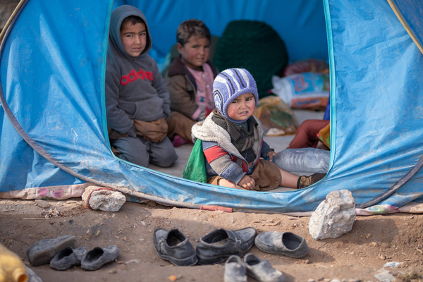 ヘラートの国内避難民キャンプ内のテントで暮らす子どもたち。(アフガニスタン、2022年1月撮影)