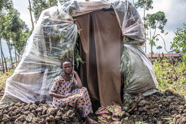 北キブ州の国内避難民キャンプで、仮住まいの入り口に座る避難民の女の子。(コンゴ民主共和国、2022年5月31日撮影)