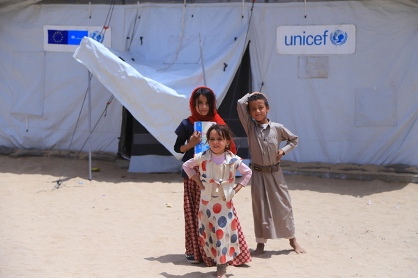 マリブの国内避難民キャンプで、ユニセフが設置したテント式の一時的な学習空間に通う子どもたち。(イエメン、2022年3月撮影)