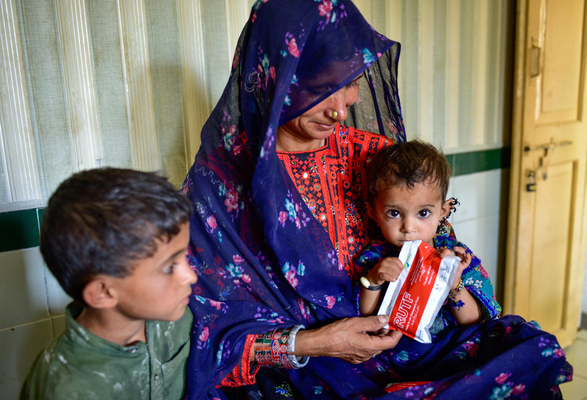 バロチスタン州にある保健センターで、すぐに食べられる栄養治療食(RUTF)を口にする栄養不良の生後10カ月のザリーンちゃん。(パキスタン、2022年5月撮影)