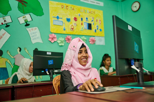 ユニセフが提供するデジタルリテラシー研修を受ける16歳のサディヤさん。(バングラデシュ、2022年1月撮影)