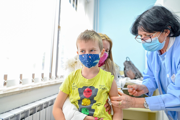 三種混合ワクチン(DTP:ジフテリア・百日咳・破傷風混合ワクチン)の接種を受ける7歳のアレクセイちゃん。(北マケドニア、2022年1月撮影)