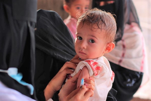 ユニセフの緊急予防接種キャンペーンで、はしかと風疹の予防接種を受ける子ども。(イエメン、2022年5月撮影)