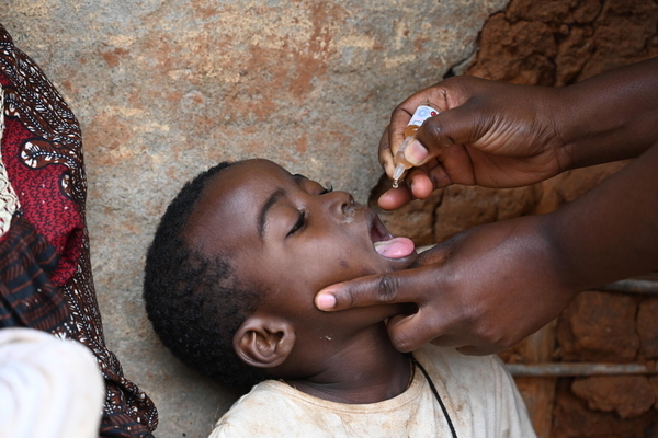 ポリオの予防接種キャンペーンで、ポリオワクチンの投与を受ける子ども。(カメルーン、2022年6月30日撮影)