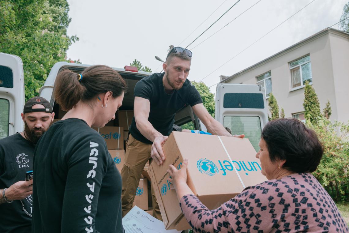 避難している家族に、生活必需品などの支援物資を届ける、ユニセフのスタッフ。
