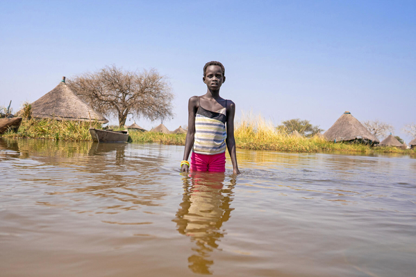 洪水の被害にあったジョングレイ州の村で、浸水した道の上に立つ12歳の子ども。(南スーダン、2022年1月撮影)