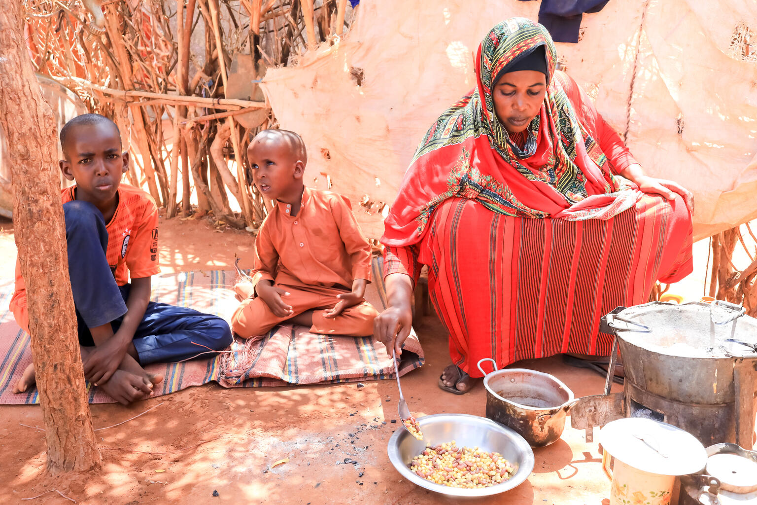 ソマリアのドローの避難民キャンプで、ユニセフの支援で受け取った穀物で、家族のための食事をつくるファドゥマ・アブディ・ノールさん(37)と子どもたち。
