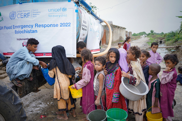 バロチスタン州・Lasbela地区の村に届いた、ユニセフの支援で設置した給水車から安全な水を受け取るため、列に並ぶ子どもたち。(パキスタン、2022年8月24日撮影)