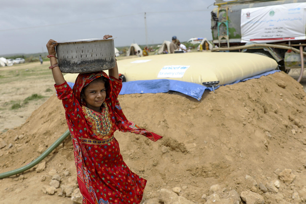 シンド州・Thatta地区の避難所で、ユニセフが設置した給水タンクから水を汲み、滞在するテントに戻る途中の9歳のアーシアさん。(パキスタン、2022年8月28日撮影)
