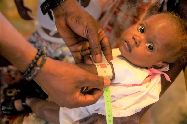 上腕計測メジャーで「赤」が示され、重度の栄養不良と診断された。シテ・ソレイユの5人に1人の子どもは急性栄養不良になっている。(ハイチ、2022年5月撮影)