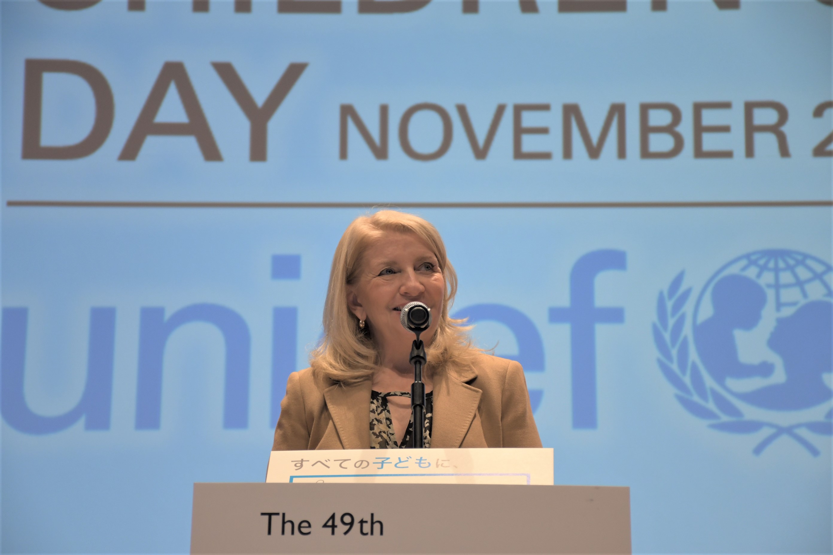 「特別番組をご覧いただきながら、「すべての子どもに」の後に続く、この(ボードの)空欄に入る言葉を、考えてみてください。」(挨拶に立つキャサリン・ラッセル ユニセフ事務局長)
