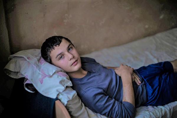 リヴィウの小児科病院のベッドに横たわる12歳のミハイロさん。自宅の庭にロケット弾が落ち、父親は亡くなった。ミハイロさんも負傷し、頭には2つの破片が刺さった状態でいる。(ウクライナ、2022年9月撮影)