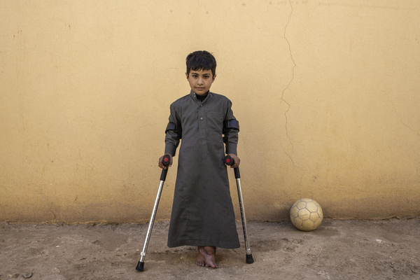 ファルージャで、友達と遊んでいる時に不発弾の破片が爆発し、足を負傷したため松葉杖を使う8歳のディアブさん。爆発により耳が聞こえにくくなり、今も耳が痛む。(イラク、2022年2月撮影)