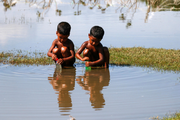 南部にあるベンガル湾で、サイクロンの影響により浸水した場所から、生活に使える物を探す子どもたち。(バングラデシュ、2022年10月25日撮影)