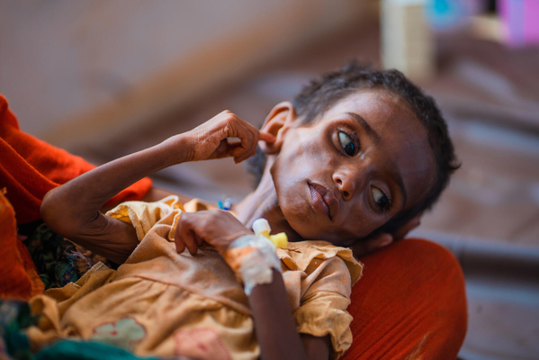 栄養不良で病院の栄養集中治療室に入院し、ユニセフの支援による治療を受ける2歳のラキアトウちゃん。(マリ、2022年8月撮影)