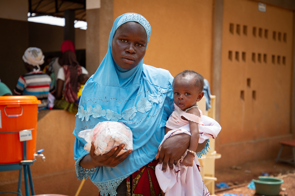 重度の急性栄養不良で生後6カ月のアブドゥルちゃんを抱く母親。カヤの保健センターで、子どもの栄養治療食のプランピーナッツを受け取った。(ブルキナファソ、2022年6月撮影)