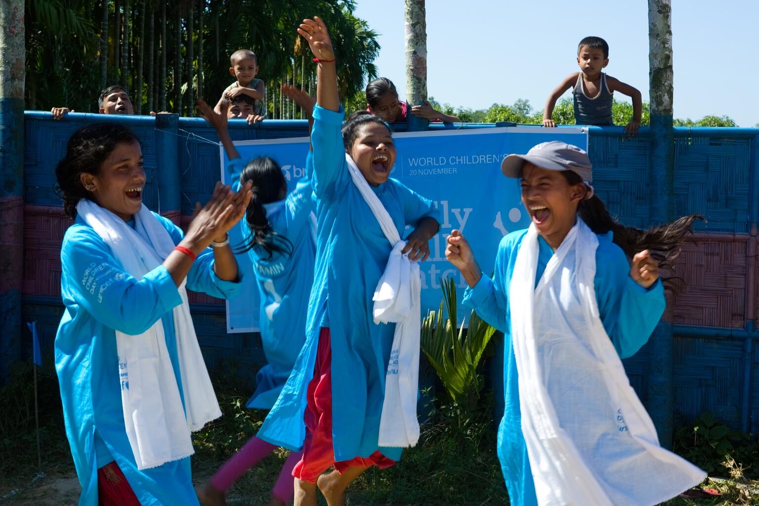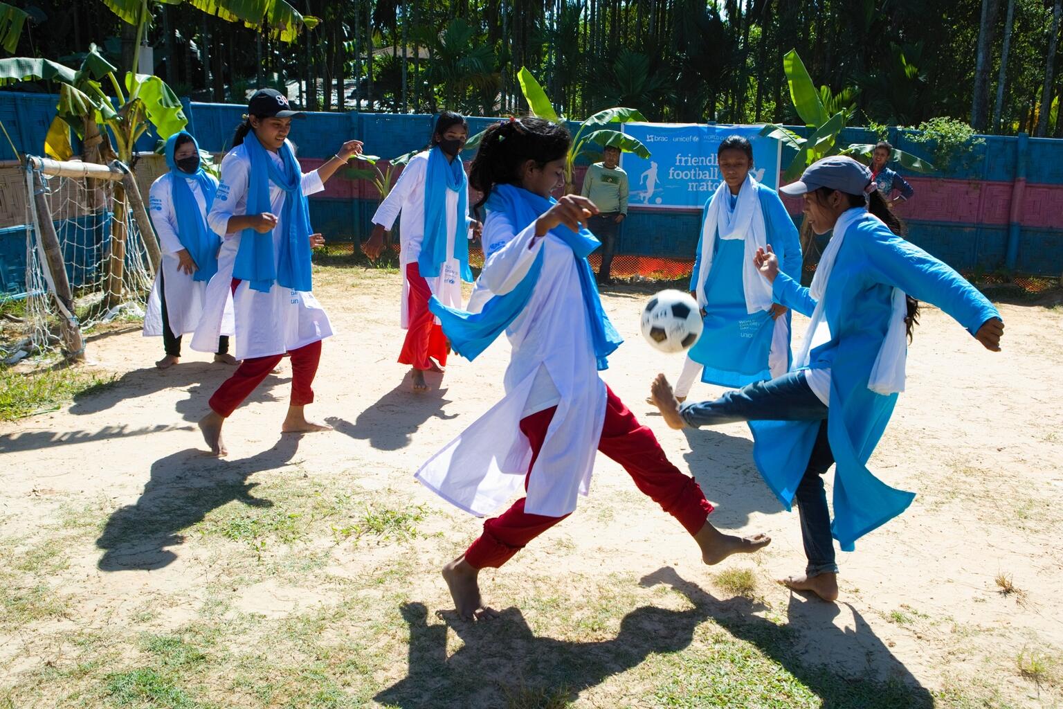 ユニセフが設置するソーシャルハブで、サッカーを通して交流を深める女の子たち(バングラデシュ、2022年11月撮影)
