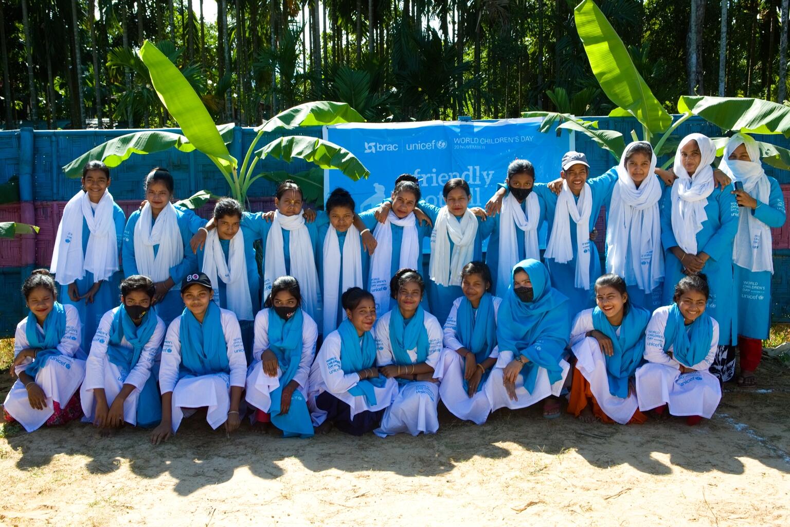 サッカーの試合に参加し、仲良く記念撮影をする、ロヒンギャ難民の女の子たちとホストコミュニティの女の子たち。(バングラデシュ、2022年11月撮影)