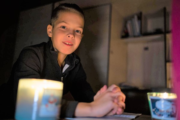 ブチャで、キャンドルの明かりを使って宿題をする11歳のティモフェイさん。日中は空襲のサイレンが鳴り、学校の授業が中断されることも多い。(ウクライナ、2022年11月撮影)