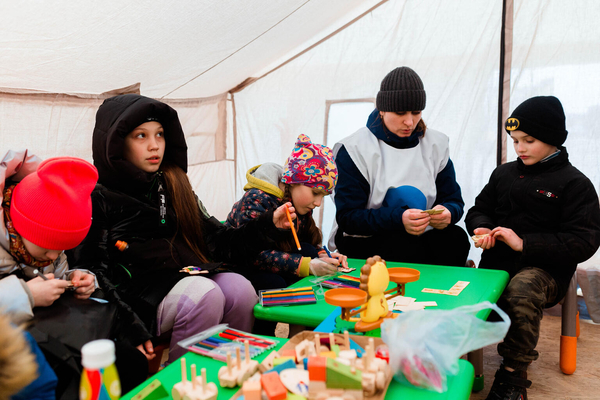 ウクライナの戦闘を逃れて隣国に避難してくる子どもたちや家族は後を絶ちません。ユニセフはパートナー機関と協力し、ウクライナとの国境付近に、ウクライナ難民の子どもと家族のための支援拠点「ブルードット」を設置しています。写真はモルドバのブルードット内の「子どもにやさしい空間」で、スタッフが見守る中、遊ぶ難民の子どもたち。(モルドバ、2022年3月撮影)